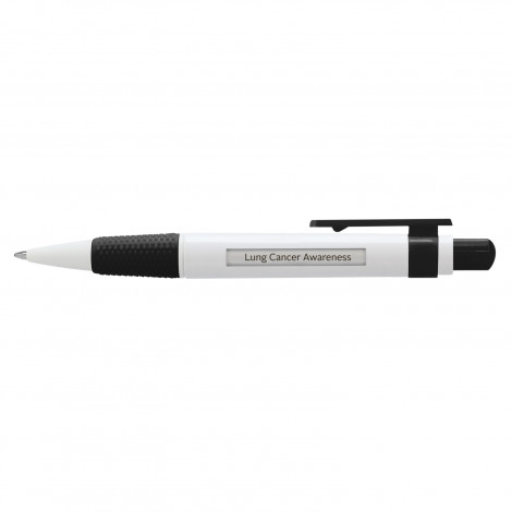 Retractable plastic ballpoint pen with a white barrel, a soft rubber grip and a rotating inner barrel which holds six different messages. Each time the push button is clicked, a new message is displayed in the two clear barrel windows. It has a blue or black refill with 1200 metres of German manufactured Dokumental ink. A production lead time of 40 working days applies to this product by air freight and orders can be sea freighted on request to reduce the freight cost.