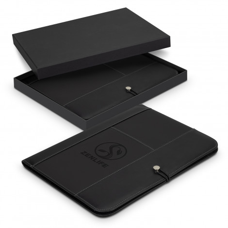 Large luxury PU portfolio with a calculator, a lined A4 pad, a pen loop, pockets for business cards and a secure closure strap. It laser engraves to a matt brown finish.