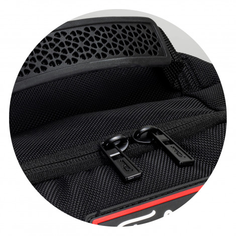 The Titleist Players Backpack combines superior quality with functional style and lives up to the brand’s reputation as golf’s symbol of excellence. The adjustable and breathable shoulder straps, ample foam lumbar support and spacious main compartments make it ideal for golfers or day trippers. Manufactured from durable 600D polyester it features three zippered compartments with generous internal organisation to securely stow a 15-inch laptop, books, wallets, pens and more. The smaller front compartment has a discrete internal zippered valuables pocket, a Velcro pocket, and a carabiner clip. Other features include a front zippered pocket which can be co-branded, two large side drink bottle sleeves, a sturdy rubber carry handle and a luggage strap so it can slide onto a rolling suitcase handle. The Titleist logo is subtly branded at the top of the main compartment and on the right shoulder strap. Please note this product cannot be supplied without the Titleist logo.