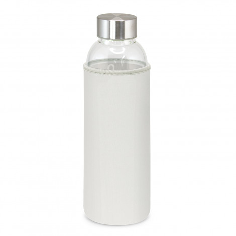 Deluxe 600ml borosilicate glass drink bottle which features an insulating soft neoprene sleeve that helps to keep drinks cool. The sleeve is nicely accented with grey neoprene trim and a grey woven polyester handle. It has a secure screw on stainless steel lid which can be laser engraved with a logo. Borosilicate is a lightweight glass that is exceptionally strong and shatter-resistant. Glass is a natural choice for a clean, pure taste and is a safe and reusable plastic alternative. This product is not intended to be used with carbonated or hot liquids. It is not dishwasher safe and handwashing is recommended.